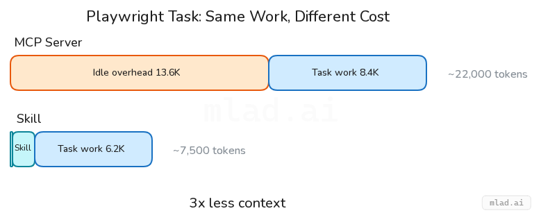 In this example, the skill approach uses 3x less context to accomplish the same task.