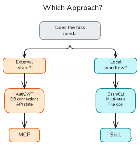The question is not MCP or skills. It is whether the capability requires persistent connection and external state, or whether it is a workflow Claude can execute with existing tools.