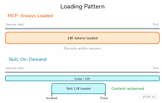 The loading is progressive. The skill index holds a one-line summary of each available skill, around 100 tokens total for a dozen skills. When you invoke a skill, the full instructions load into context. When the task is done, that context can be reclaimed. MCP definitions persist for the entire session regardless of use.